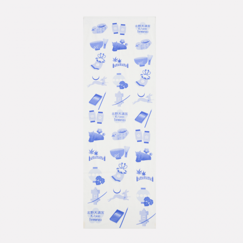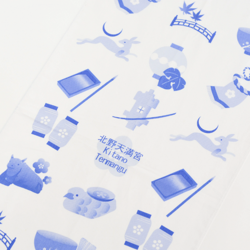 清らかな青を基調に、北野天満宮にゆかりのあるモチーフを散りばめたオリジナル手ぬぐいです。梅の花、撫牛、抹茶、筆など道真公と縁深い品々が配置され、気品ある佇まいに仕上げました。青は知性や静けさを象徴する色。身近に置くことで、心を整え、落ち着きをもたらしてくれる一枚です。