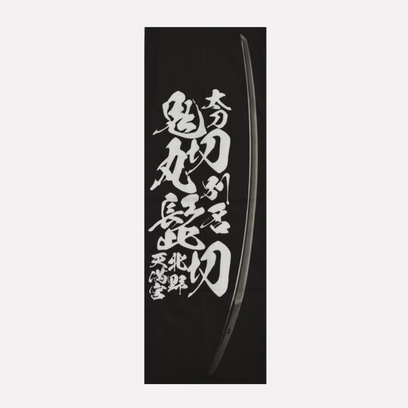 平安の名刀「鬼切丸 別名 髭切」――源氏の重宝として名高く、現在は当宮に奉納されるこの刀の姿を、力強い筆致とともに手拭いに写し取りました。刀と文字のコントラストが、刀の歴史と威厳を感じさせます。